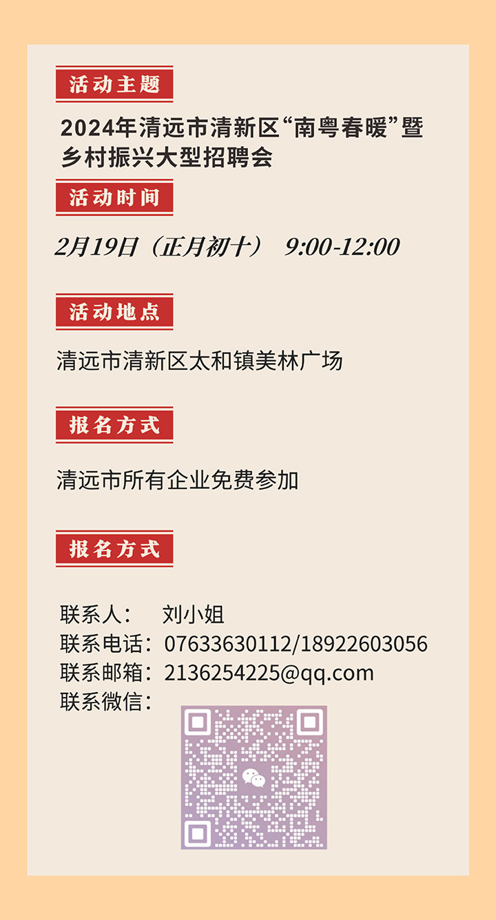 招聘會預(yù)告|2024年清遠(yuǎn)市清新區(qū)“南粵春暖”暨鄉(xiāng)村振興大型招聘會